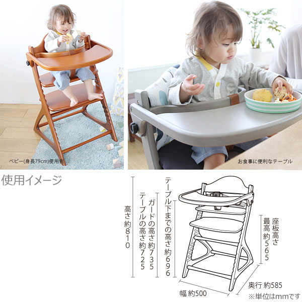 商品概要 成長に合わせ、細かく高さ調節でき、いつも足が届く姿勢で座ることができるベビーチェア。