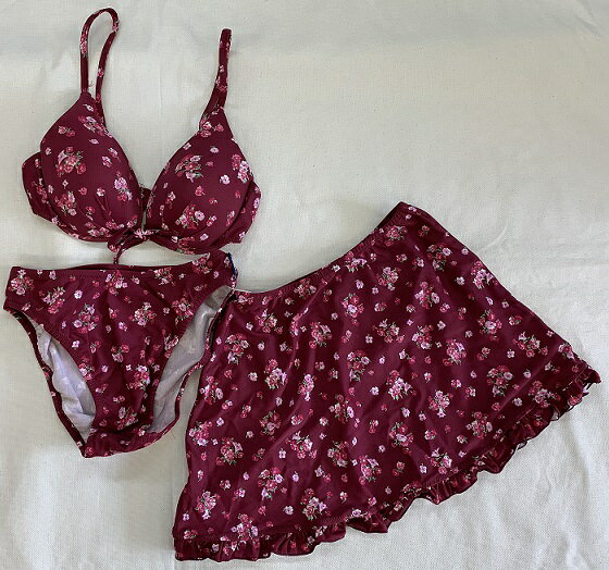 9Mサイズ 3,500円で! エレッセ 【ellesse】 レディース 水着 ビキニ 3点セット スカート付き きれいなバストを作るツインパット♪ EB3836 WNワイン